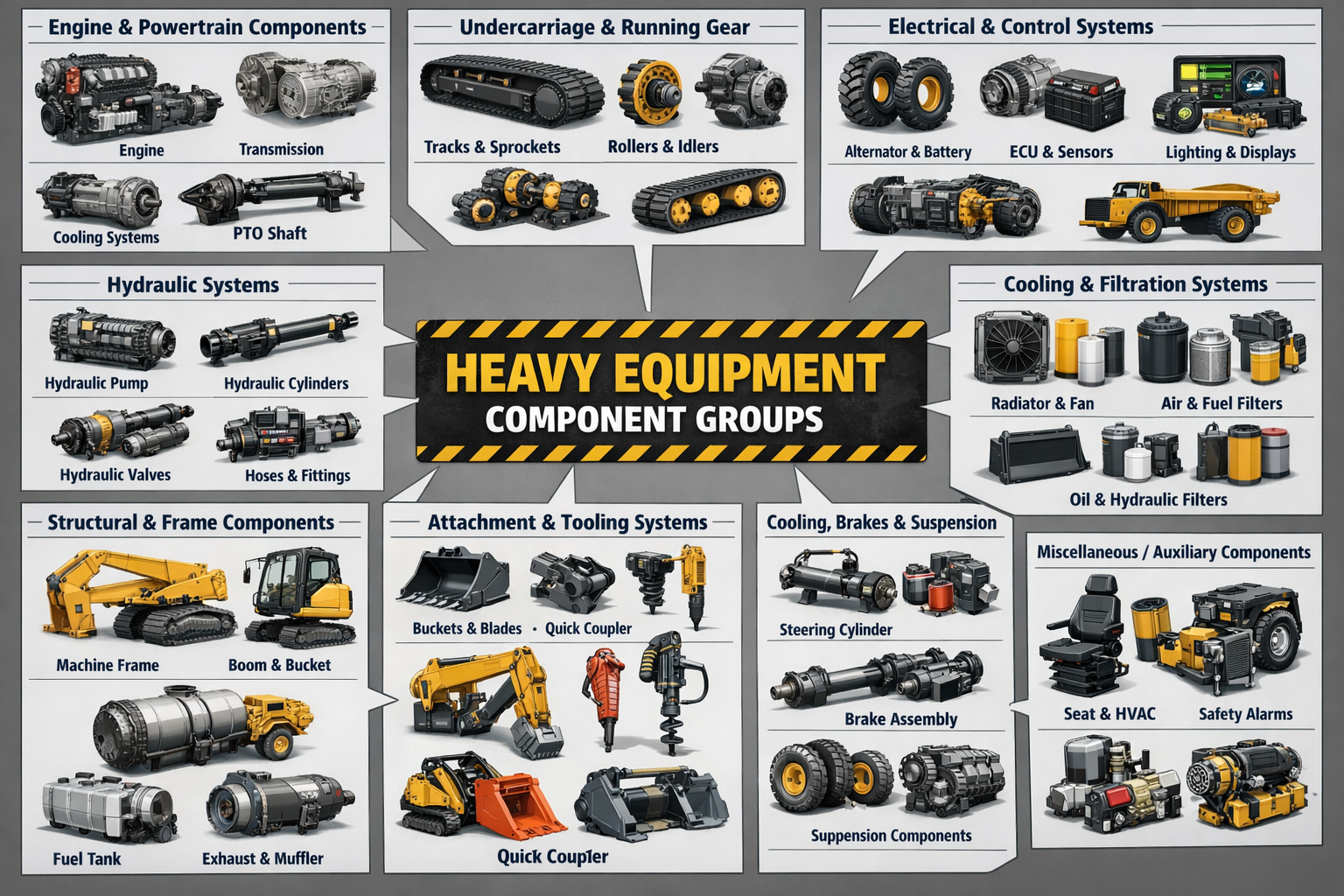 Construction Machinery: Excavators, loaders, backhoes, and skid steers.